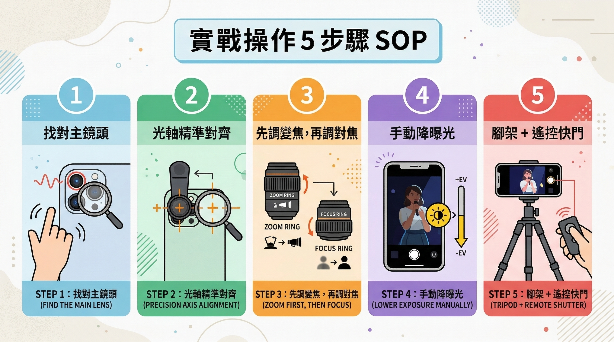 - STEP 2:光軸精準對齊。夾具圓孔必須正對手機主鏡頭中心。沒對準,畫面邊緣就會出現黑影暗角。