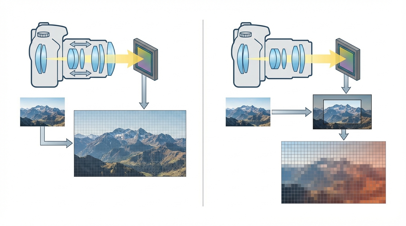 這個問題我被問過很多次。老實說,如果你沒用過光學鏡頭,你根本不知道自己手機拉大的畫面有多爛。這裡有個殘酷的光學真相:手機內建的放大,九成以上都是數位變焦。